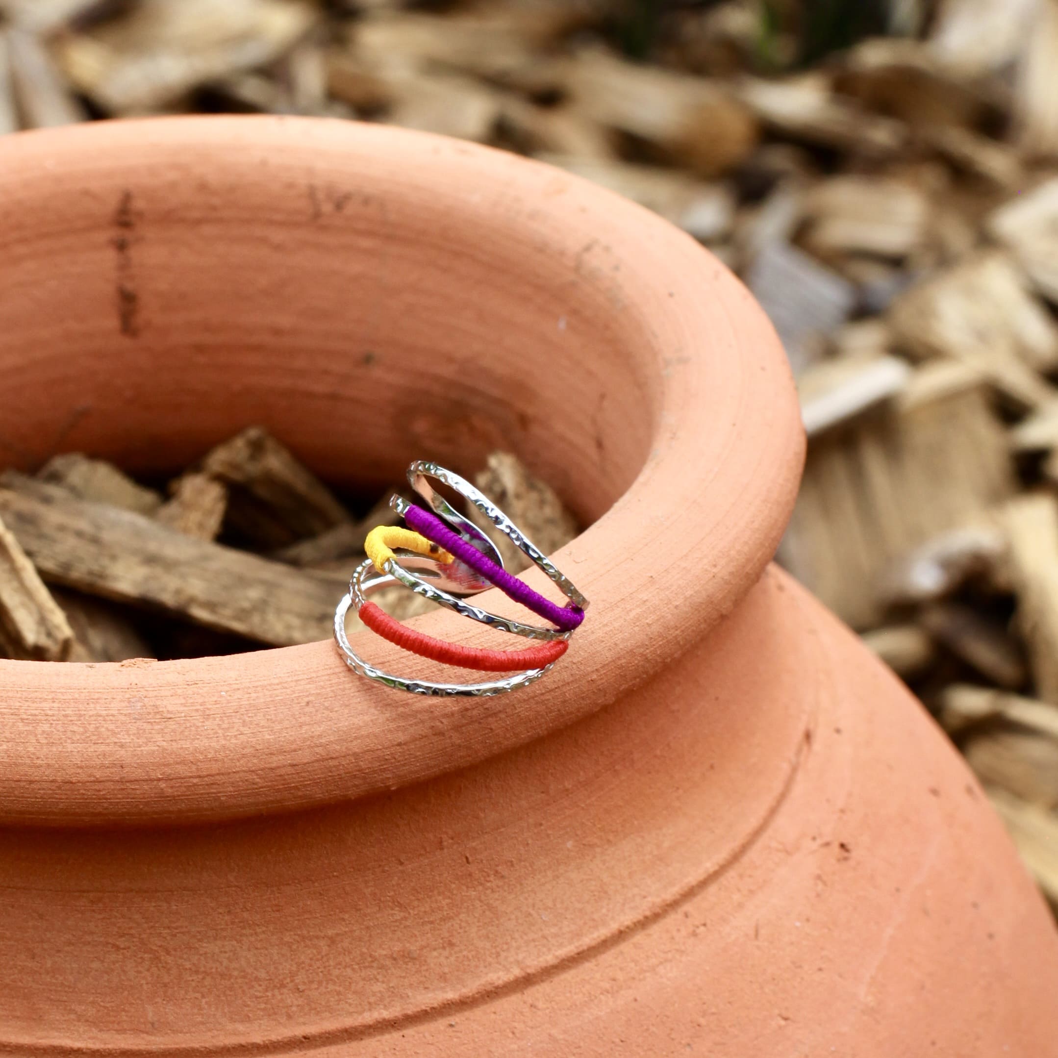 Telle une grappe de baies perchées sur son palmier. Des couleurs éclatantes au milieu d’une végétation. Cette bague est rehaussée d’une belle broderie. Celle-ci s’impose par sa couleur et se laisse bercer par le vent.