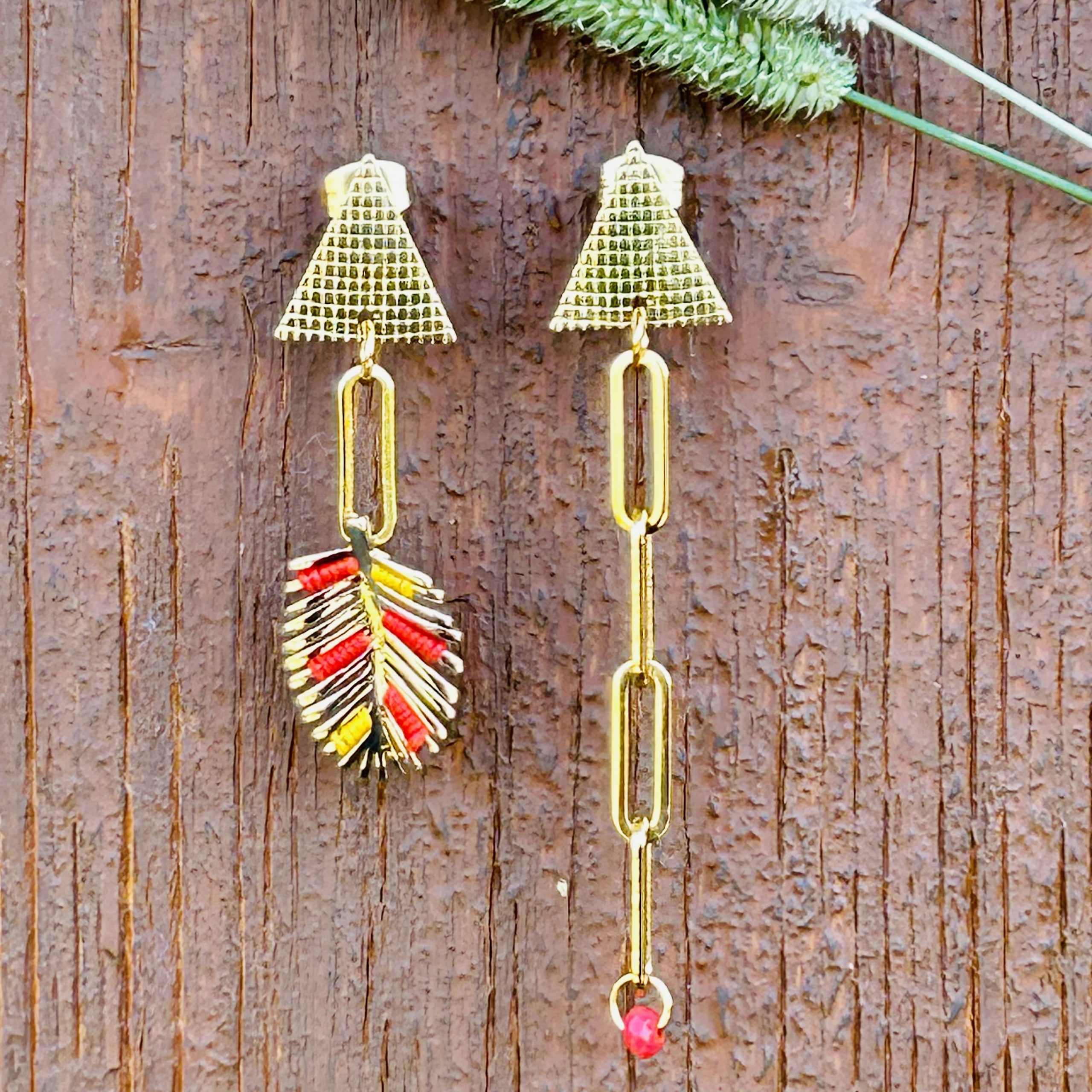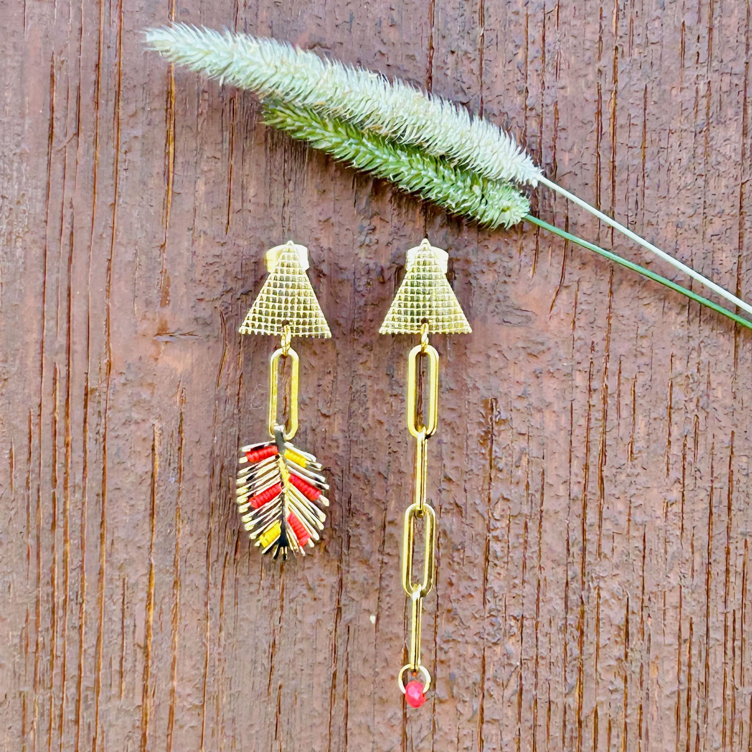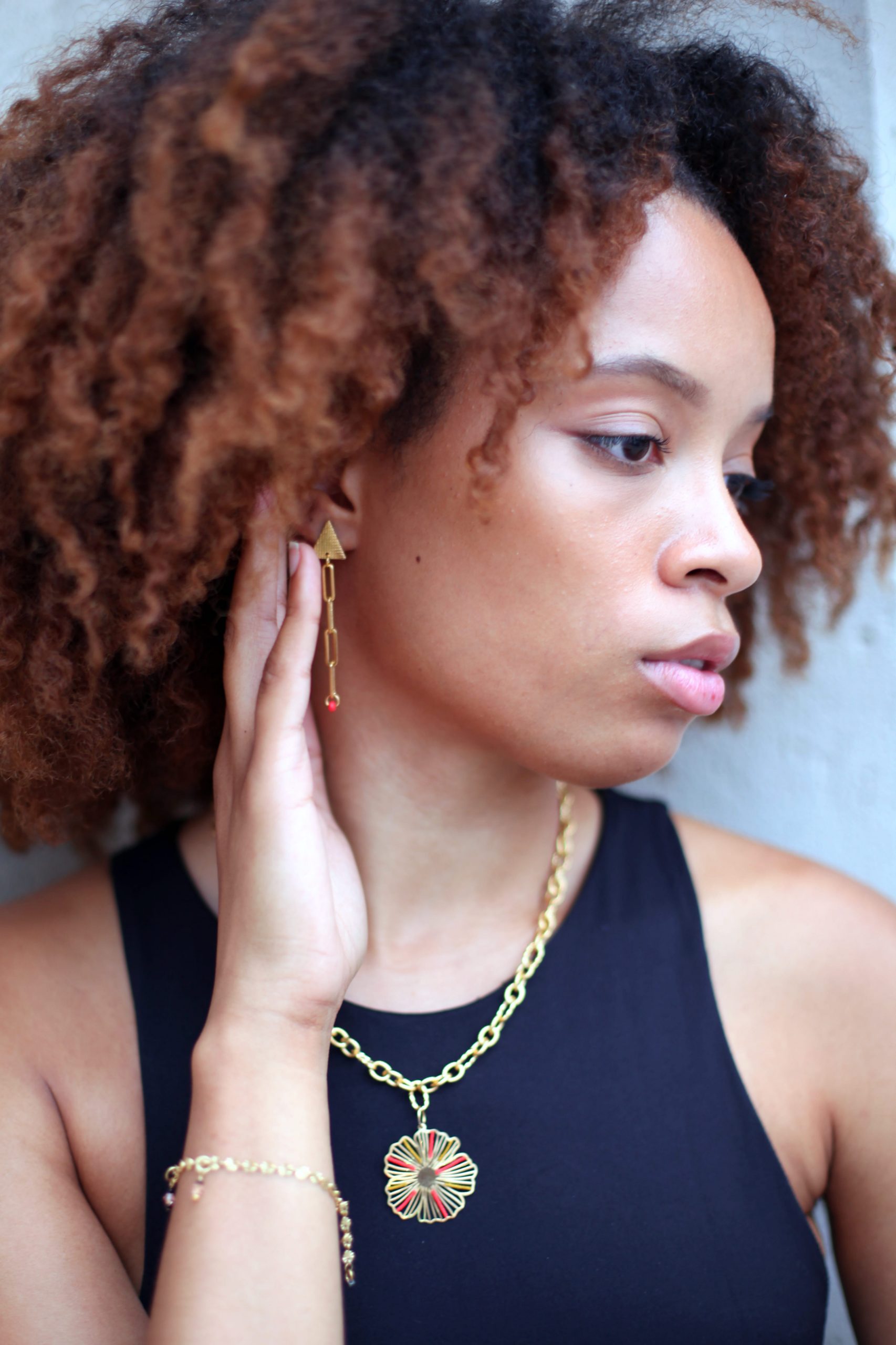Des couleurs rayonnantes pour ce bijoux. D’un côté une feuille brodée et de l’autre une chaîne ponctuée d’une pierre de Jade. De longueur différente, cette pièce interpelle. Avoir du style, c’est osé!