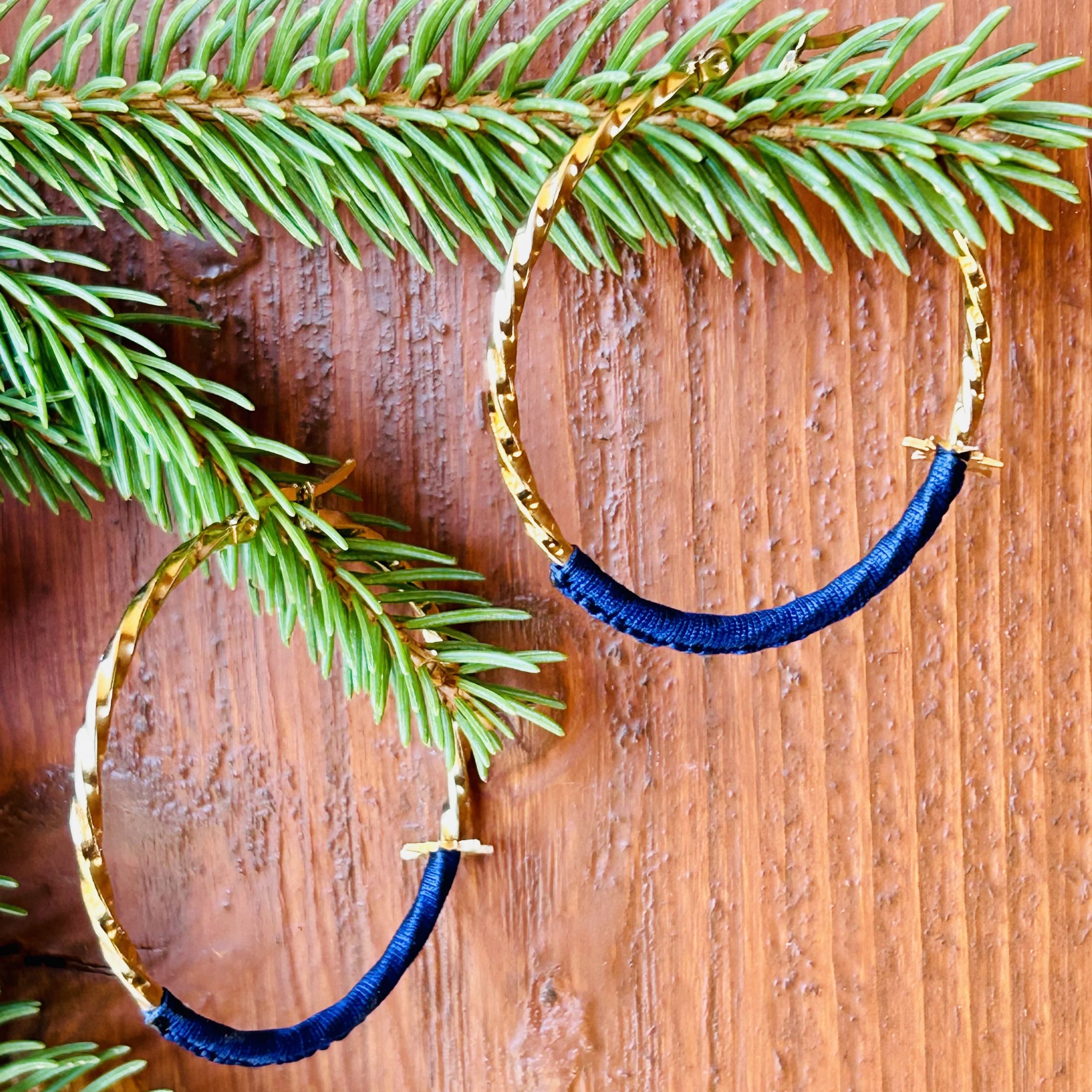 Ces créoles torsadées sont brodées de bleu avec une étoile discrète à l’arrière. Telle une liane de la forêt qui fait son show. Des créoles, oui mais stylées!
