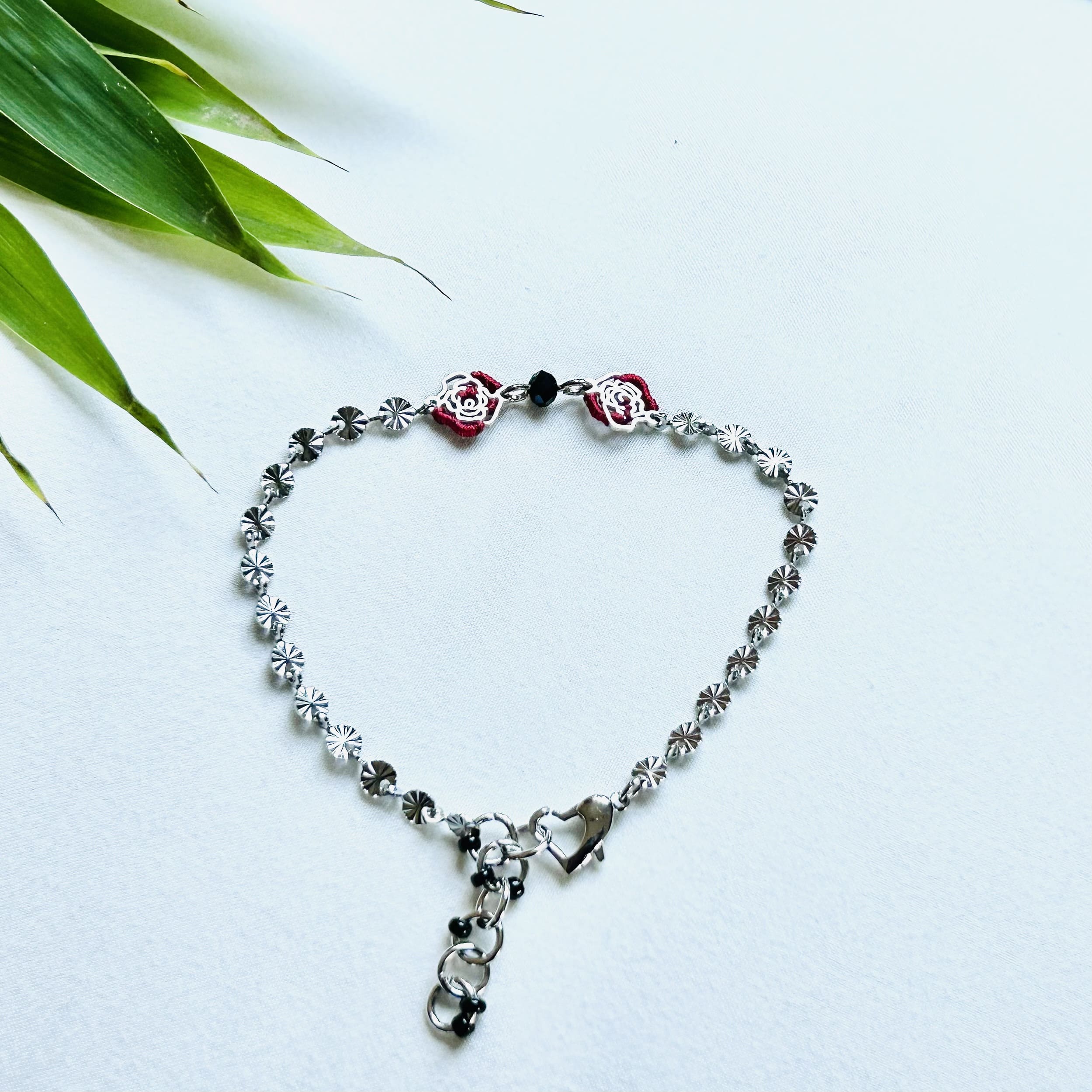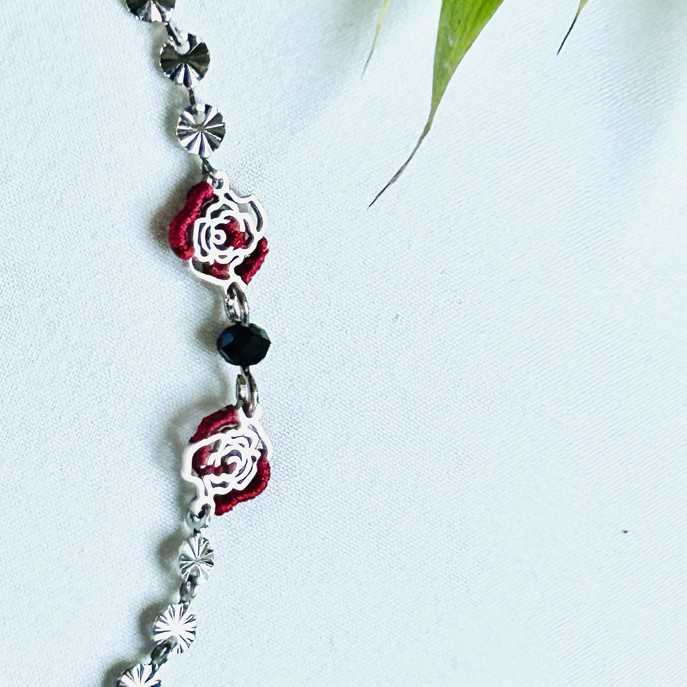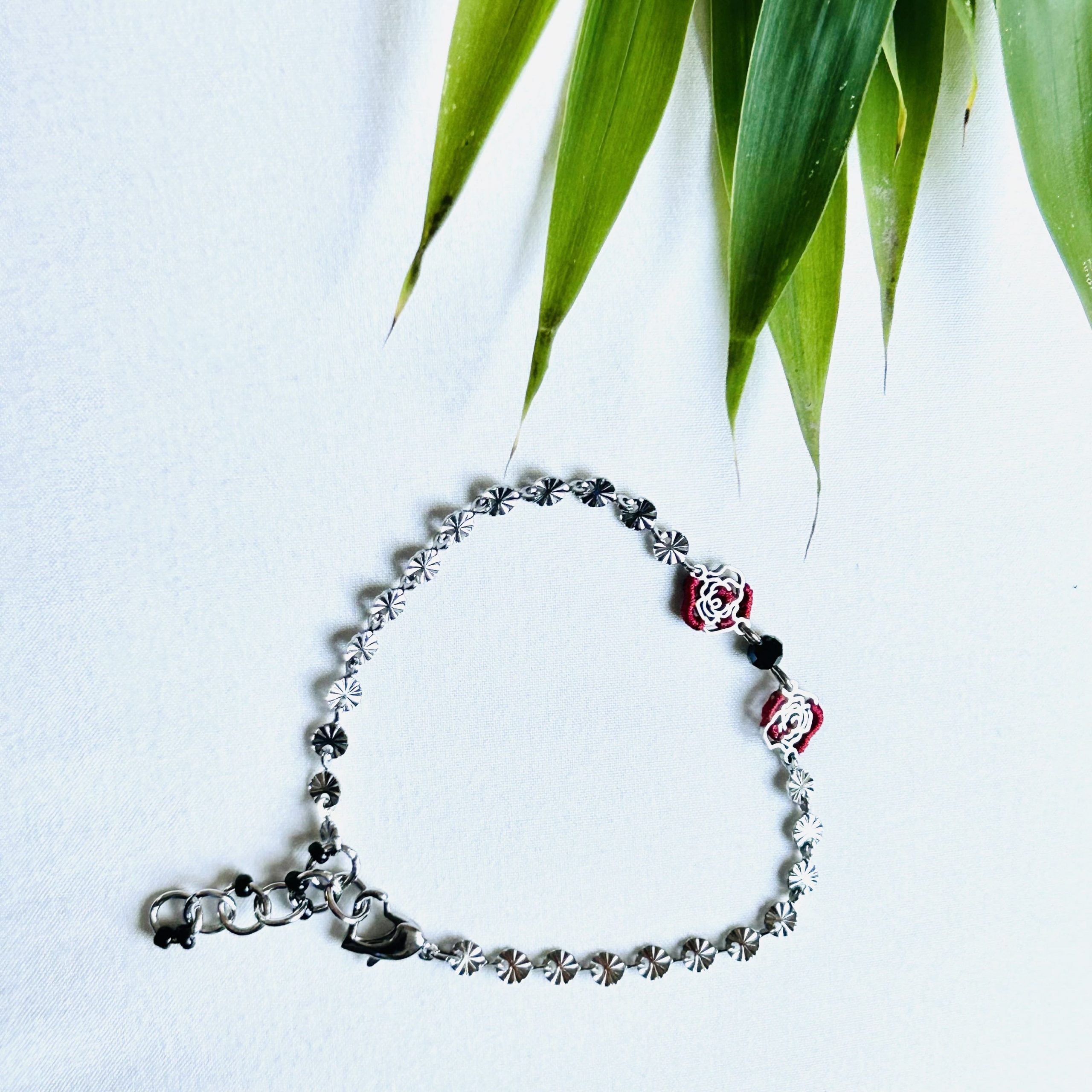 Le bracelet qui vous ressemble. Deux roses brodées finement à la main donnent de l’allure et ses couleurs rouge et noir. Jute chic ! Et, si ce duo inséparable relate une histoire pour vous ! Le tout couronné par un coeur comme fermoir. Alors, prêt pour une aventure bracelet en main avec ce bijou ?