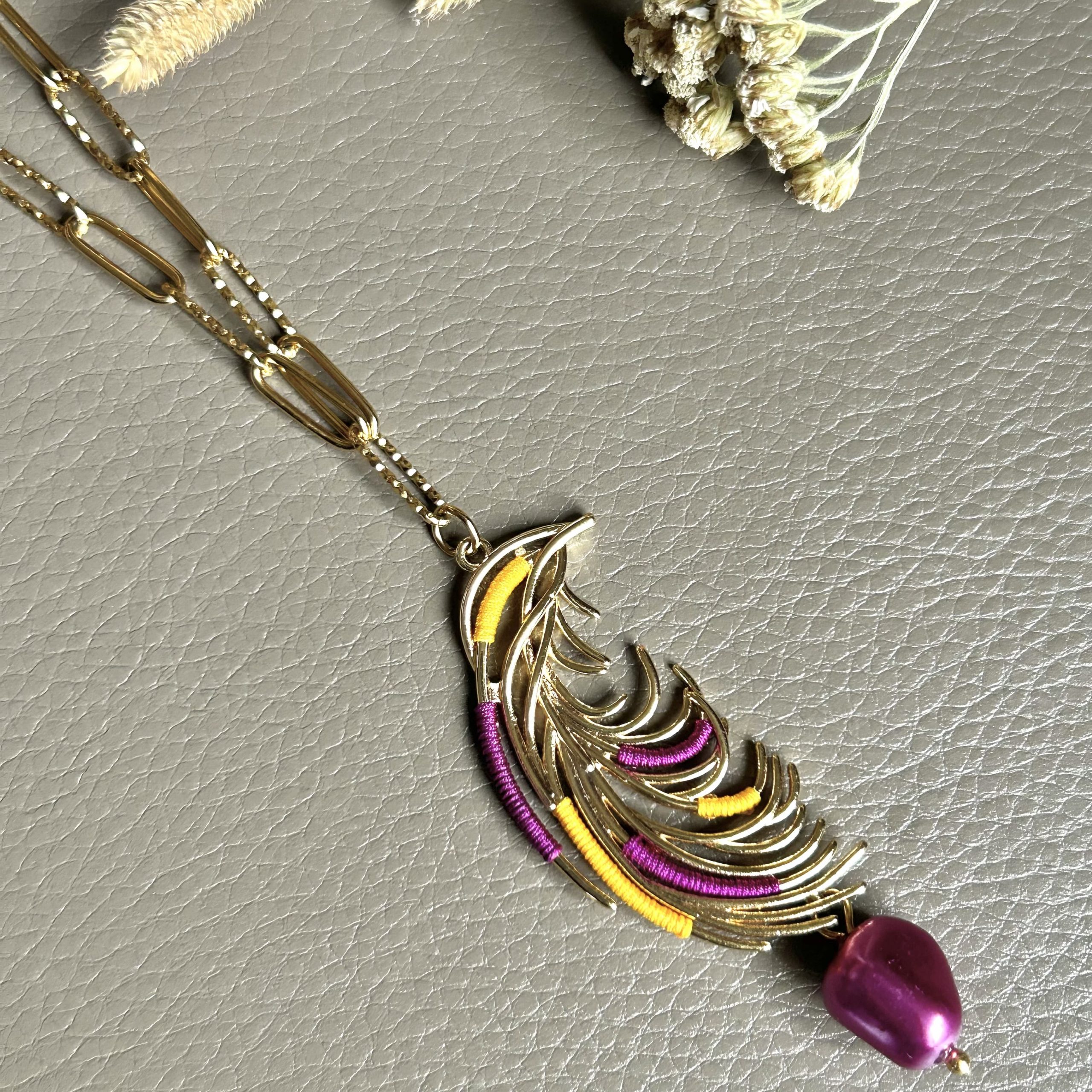 Le pendentif se pose à votre cou telle une feuille libérée de son tronc. Et, une perle comme une petite graine qui s’y attache. Son fermoir en forme de coeur, orné de perles dorées et transparentes, est tout autant soigné que la pièce maîtresse.