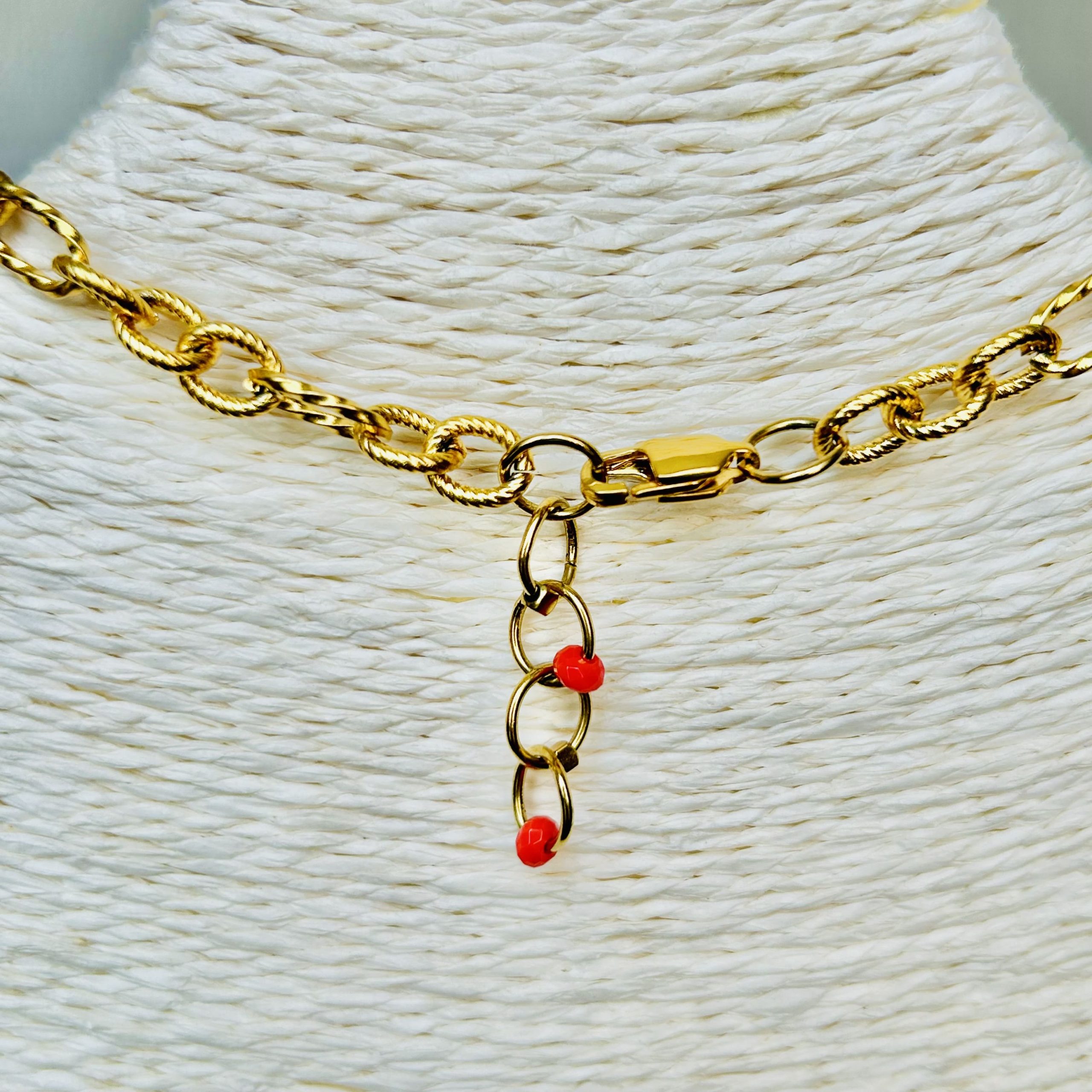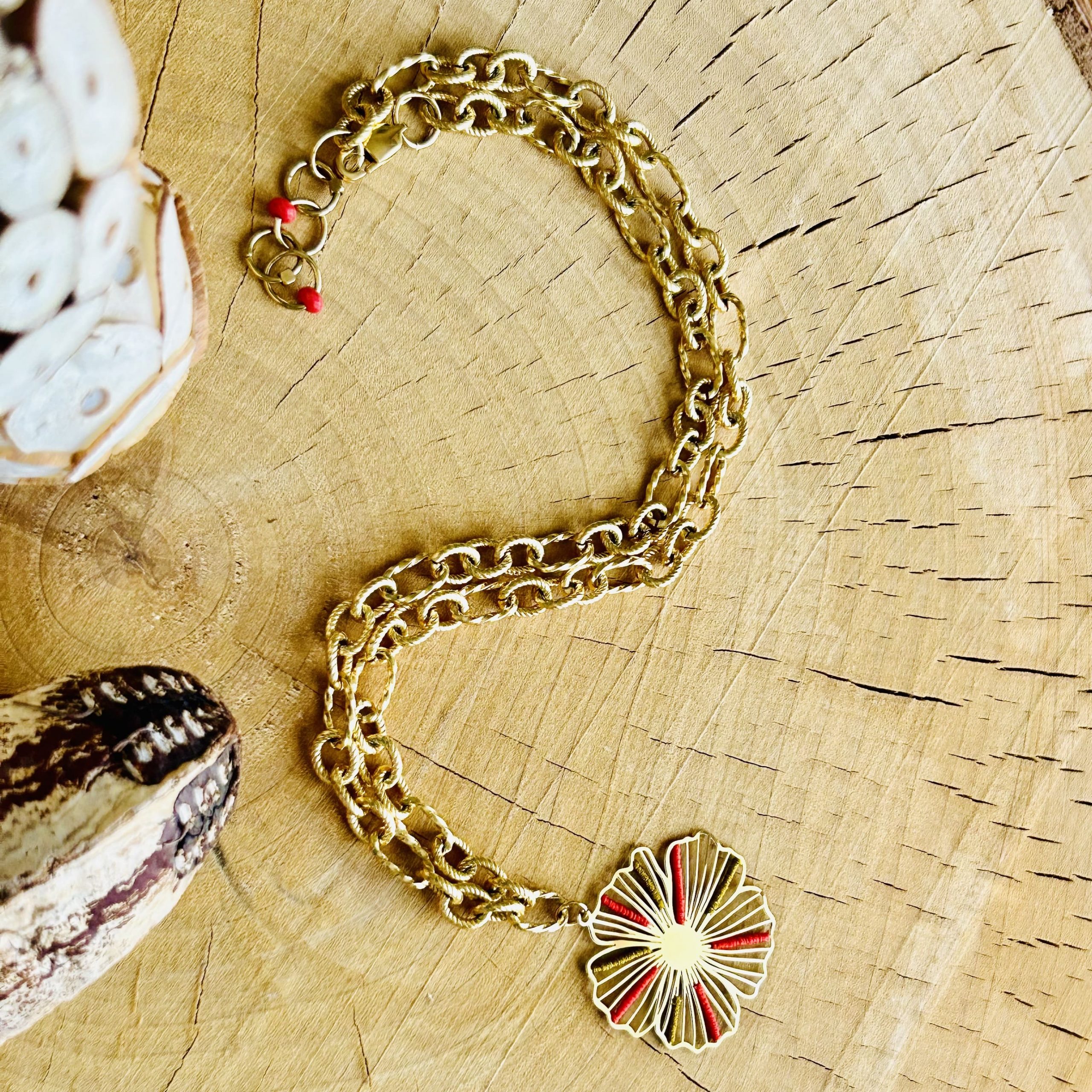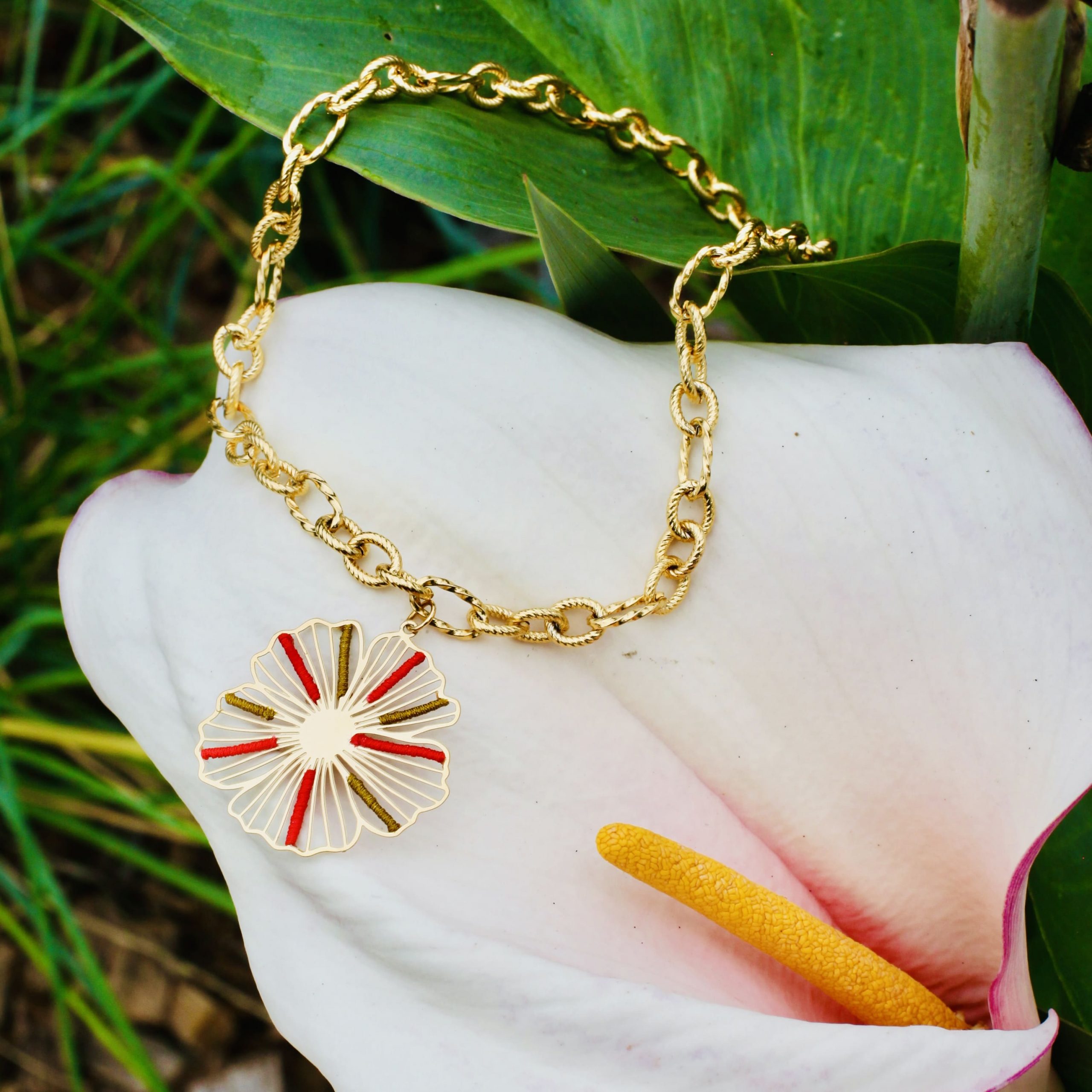 Collier qui révèle le goût de la beauté, avec son pendentif de fleur brodé en orange et vert d’or. Votre personnalité s’y reflète!